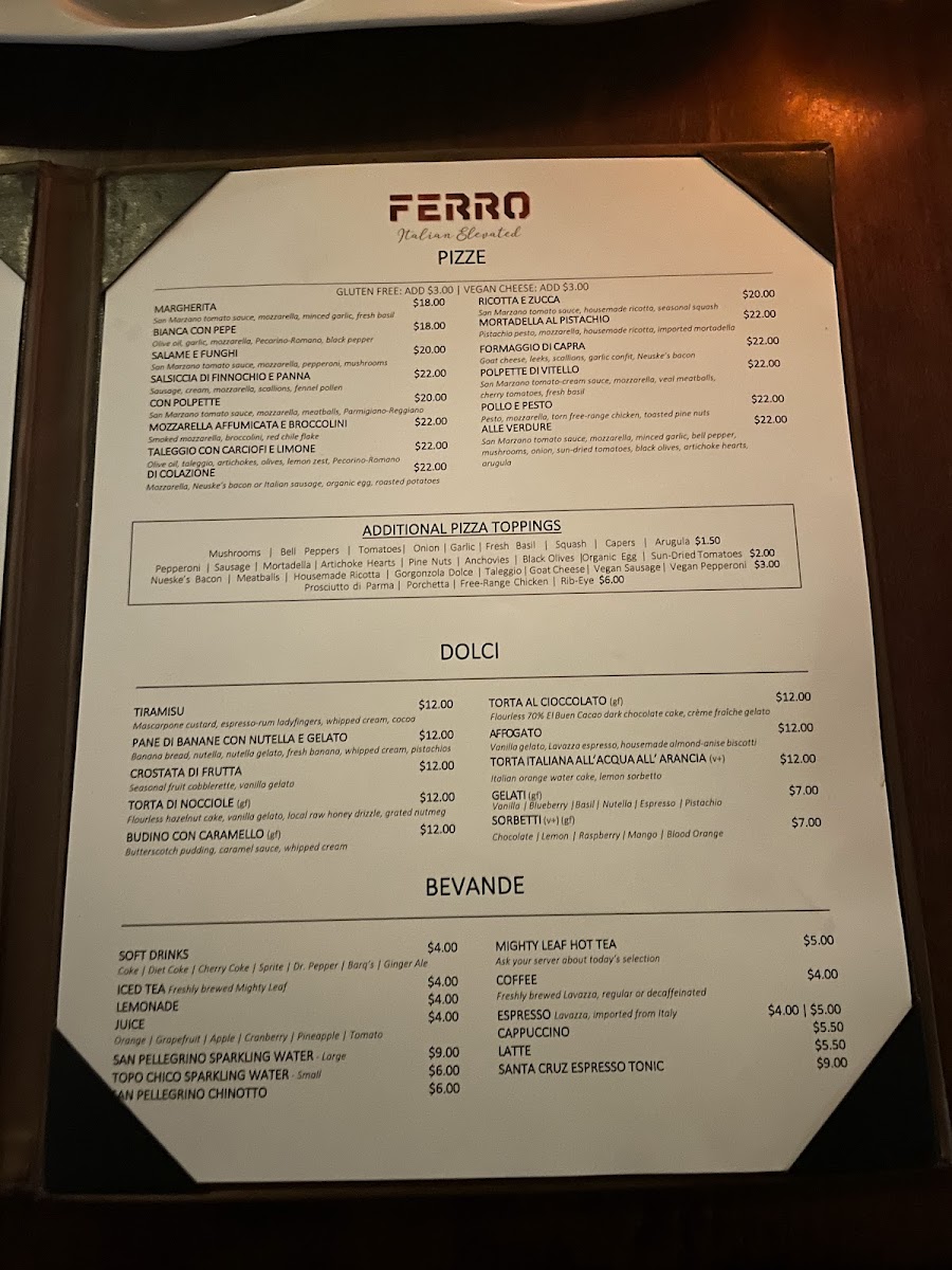 Welcome to FERRO, your go-to Italian restaurant nestled in the heart of Idyllwild-Pine Cove, CA. Located at 25840 Cedar St, this charming venue offers an enticing menu that captures the essence of Italian cuisine.